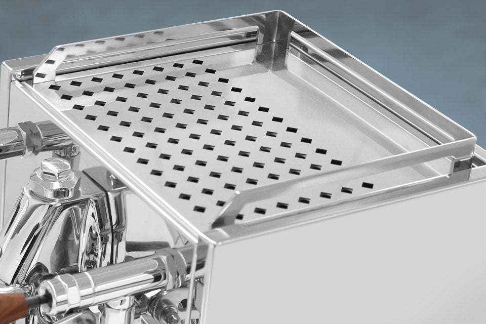 Frame van roestvrij staal, poten van gepolijst aluminium, grote kopjesverwarmer en praktische lekbak.