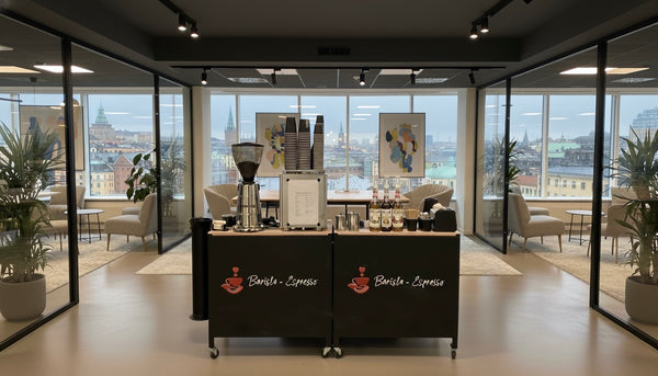 Een professional barista, Weeg uw eigen koffiespecialiteiten, complete espresso-uitrusting en -maler, transport en installatie, mokken, suiker, smaakstoffen, melk en nog veel meer! Geen gedoe - wij regelen alles!