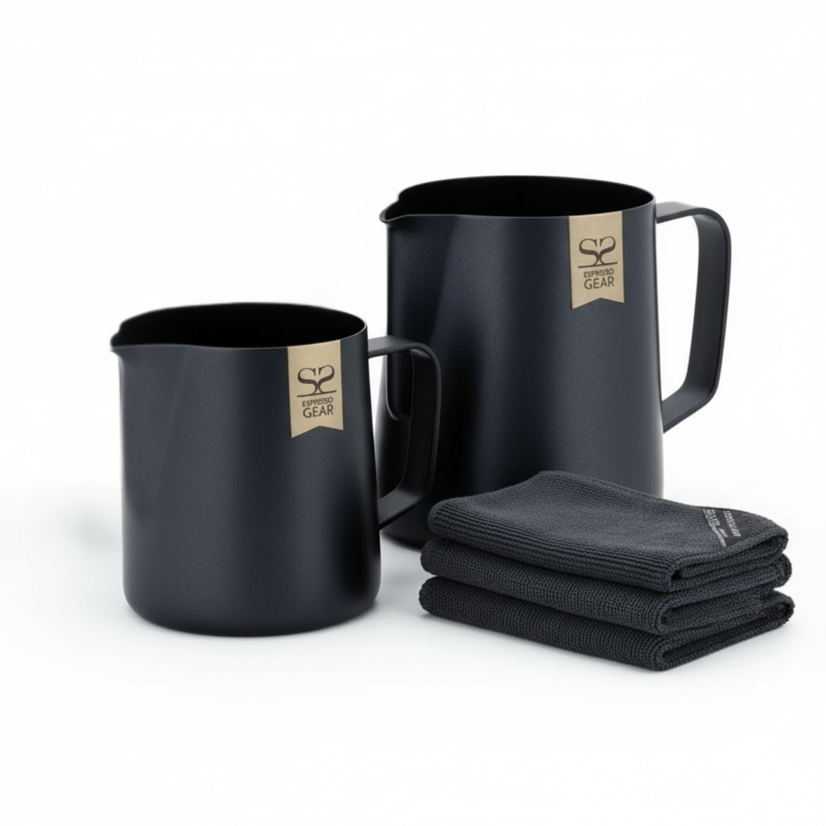 - Melkkannen: Mat zwart roestvrij staal met Espresso Gear gouden logo