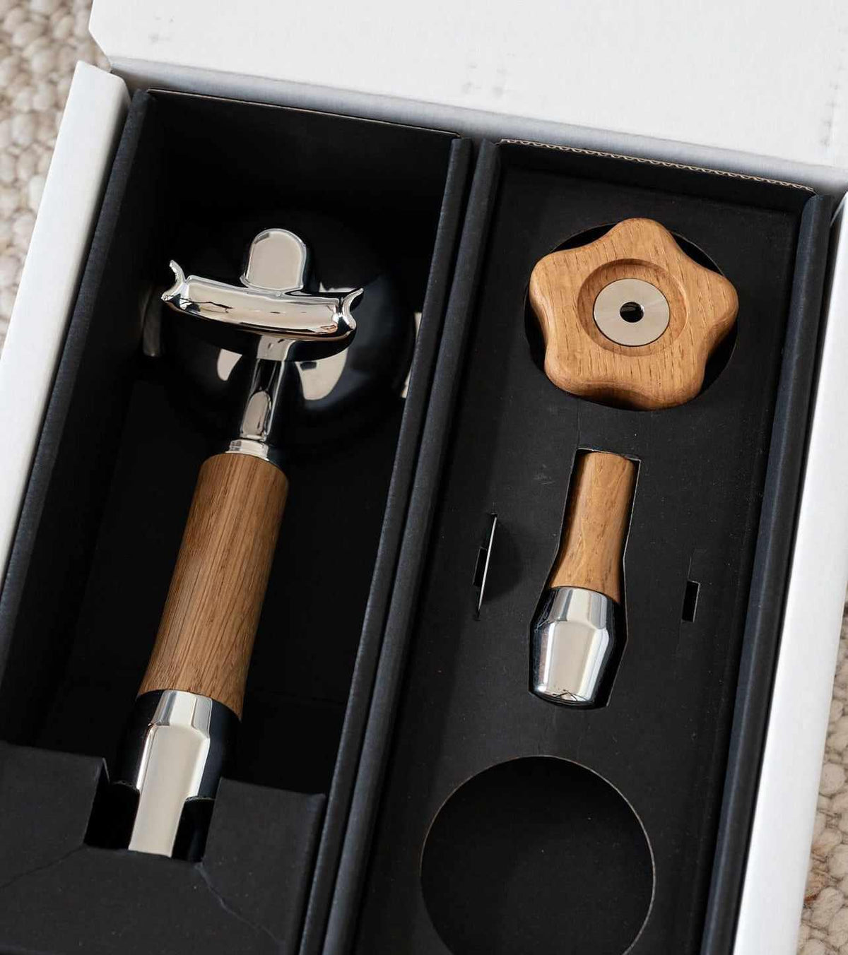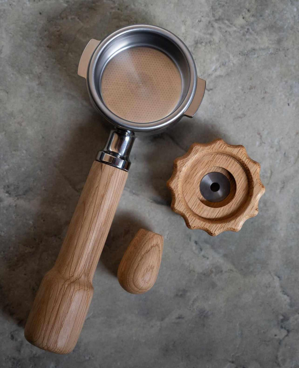 Ons handvat met het ontwerp "Elegant" wordt geleverd met originele portafilterkoppen van ECM, terwijl alle andere portafilters portafilterkoppen van roestvrij staal hebben. Elke dag biedt ons handvat een uitzonderlijke haptische ervaring. Ons hout wordt met de hand behandeld met organische harde olie, zodat het natuurlijke gevoel van het hout behouden blijft.