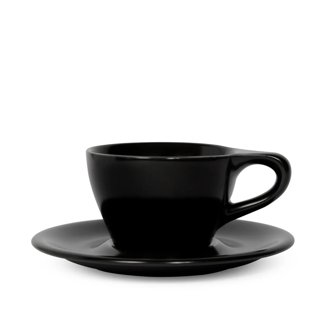 Een baristagoedgekeurde cappuccinokop van mat zwart porselein. Ontworpen samen met bekroonde barista's voor een optimale melkstroom, perfecte latte art en een professionele uitstraling in elke kop.