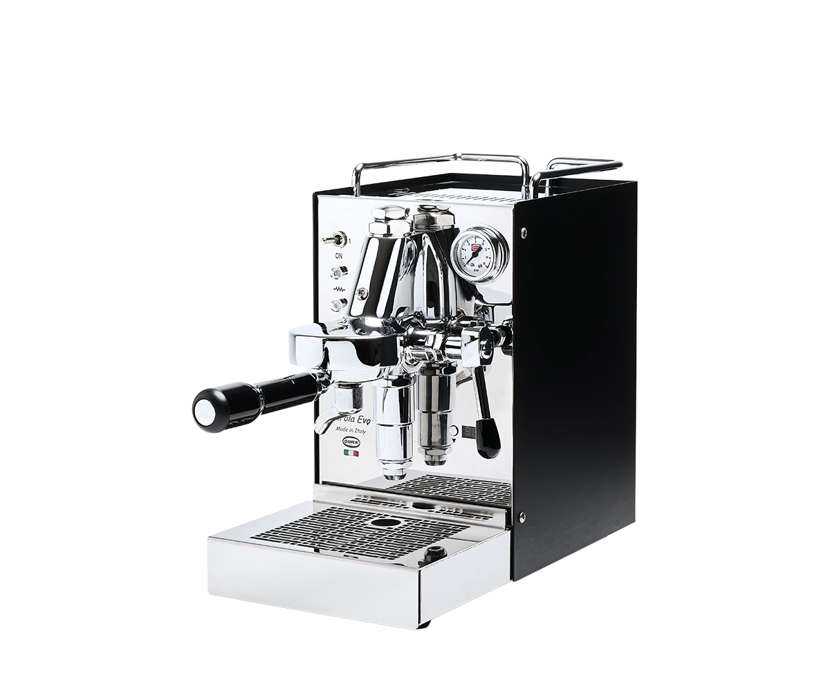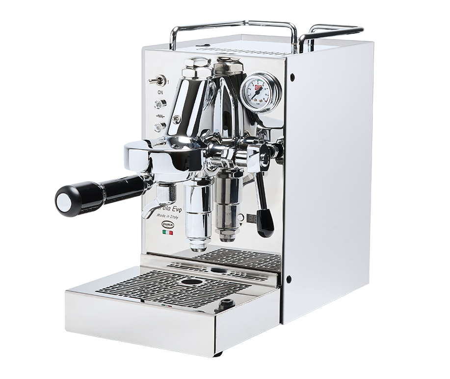 Materiaal: Volledig roestvrij staal; zijpanelen in staal of matzwart; Quick Mill zetgroep met roestvrijstalen mushroom