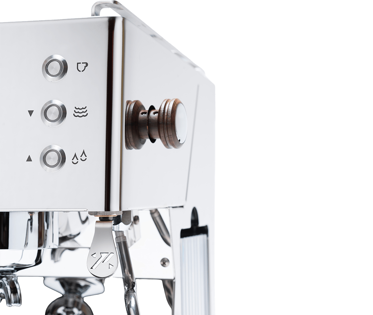De machine is verkrijgbaar in roestvrij staal of mat zwart, beide met houten details op het stoomwiel en portafilter. De ring brew group zorgt voor consistente warmte en betrouwbare bouwkwaliteit.